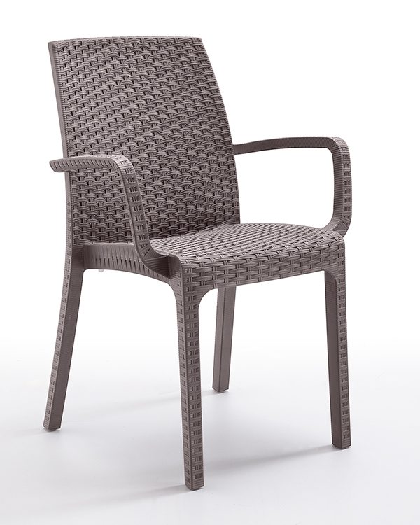 POLTRONA SCHIENALE ALTO ECORATTAN MOD. INDIANA CON BRACCIOLI E TAPPI ANTISCIVOLO, IMPILABILE, IN POLIPROPILENE, CM. 57X59H86
