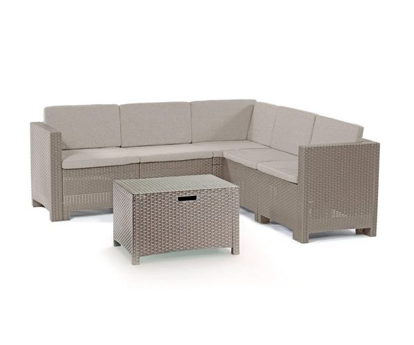 SET SALOTTO ECORATTAN COLORADO CORNER CON CUSCINI SCHIENALE E SEDUTA, COMPOSTO DA: 1 DIVANO ANGOLARE CINQUE POSTI CM. 188X181X57,5H64, 1 TAVOLINO CONTENITORE PORTA CUSCINI CM. 60X54H41